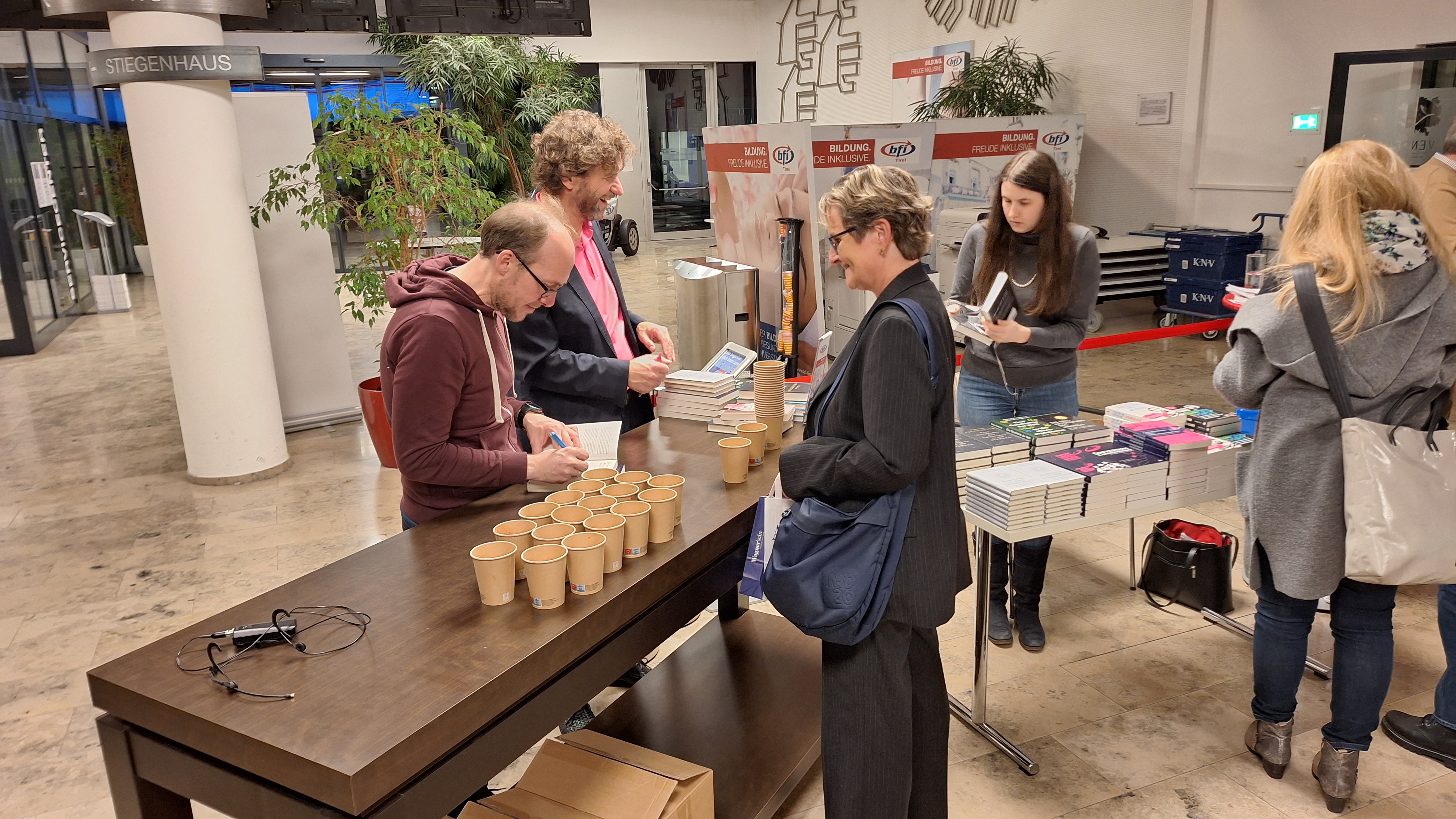 Zum Abschluss konnte man sich nicht nur bei adventlichen Köstlichkeiten verwöhnen lassen, sondern auch am Büchertisch der Wagnerschen Literatur der Science Busters erstehen. Martin Puntigam und Florian Freistetter signierten noch fleißig das eine oder andere Buch und man ließ gemeinsam mit kosmischen Cocktails und Glühwein den humorvollen Abend zugunsten von Licht ins Dunkel ausklingen.