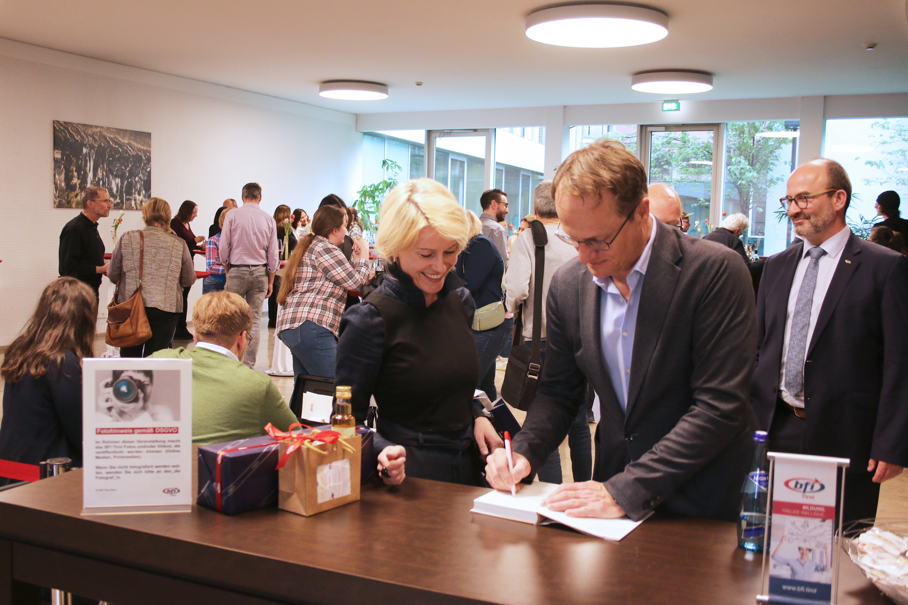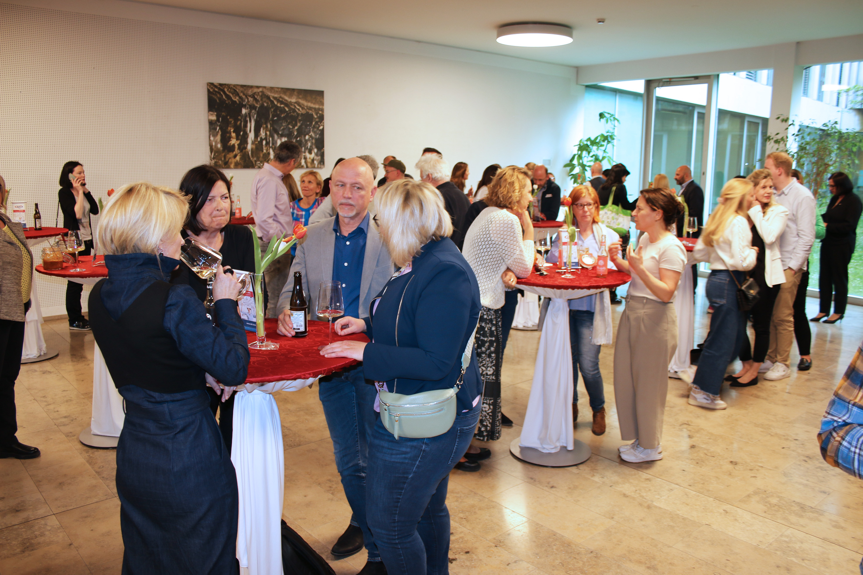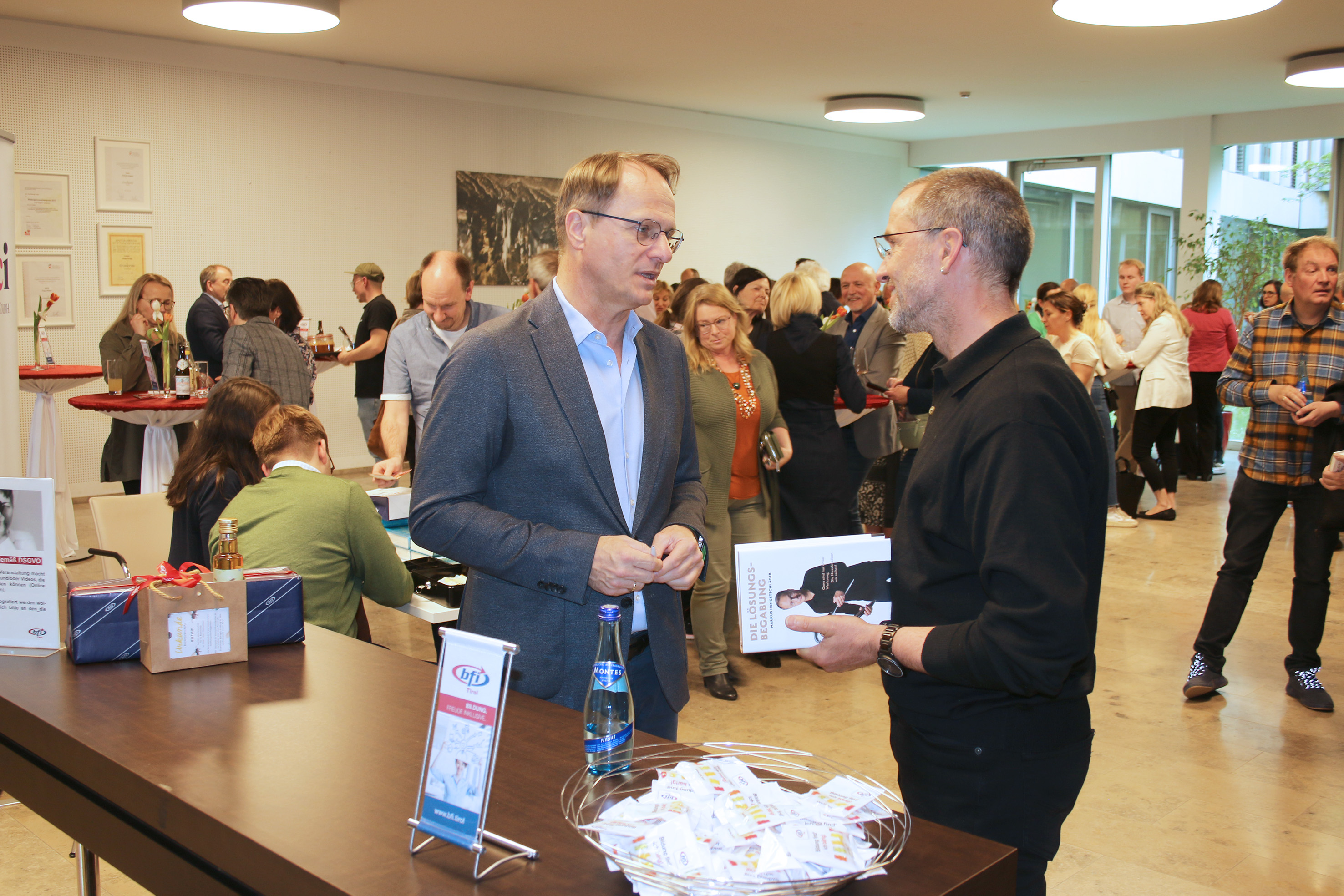 Das Publikum war begeistert vom spannenden und kurzweiligen Vortrag. Im Anschluss konnte man sich beim gemütlichen Get-together noch über die gehörten Inhalte austauschen, Kontakte pflegen und den Abend bei Köstlichkeiten der FUTTERKUTTER gemütlich ausklingen lassen. Am Bücherstand der Wagner’schen Buchhandlung gab es die Möglichkeit, sich mit Literatur von Markus Hengstschläger einzudecken, die der Autor noch persönlich signierte.
